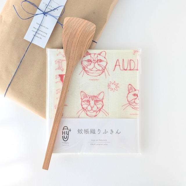 《内容》 宮島工芸製作所 イチョウ型へら 29㎝ サイズ:約29㎝×6.5㎝ 素材:国産ヤマザクラ(無塗装) 産地:広島県宮島 食洗器:✕ +HAyU fabric 蚊帳織りふきん nyanpro ベージュ/birds ブルー サイズ:約横35×縦40cm 素材:表面/綿100% 無地綿/レーヨン100% 生産国:日本