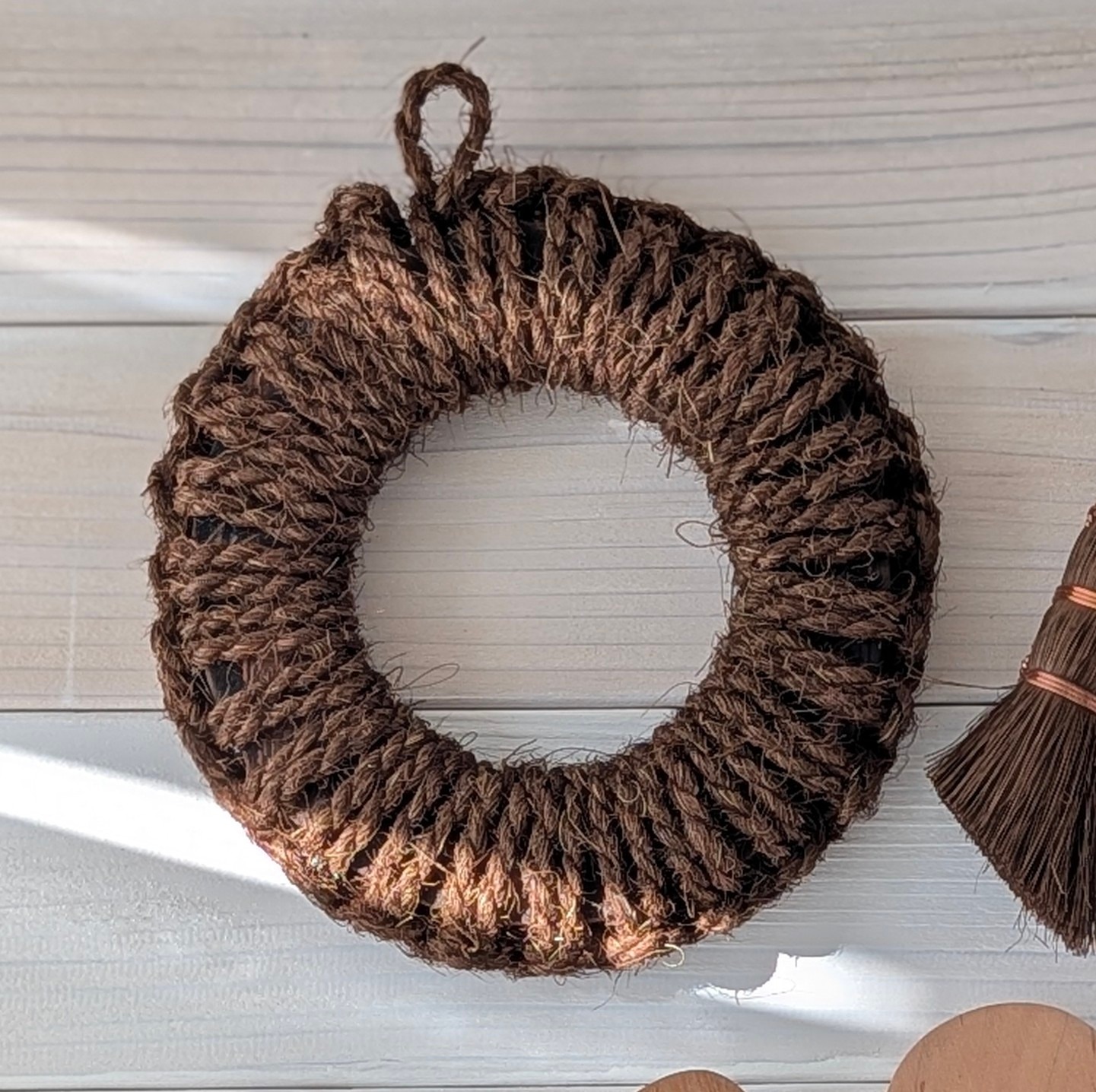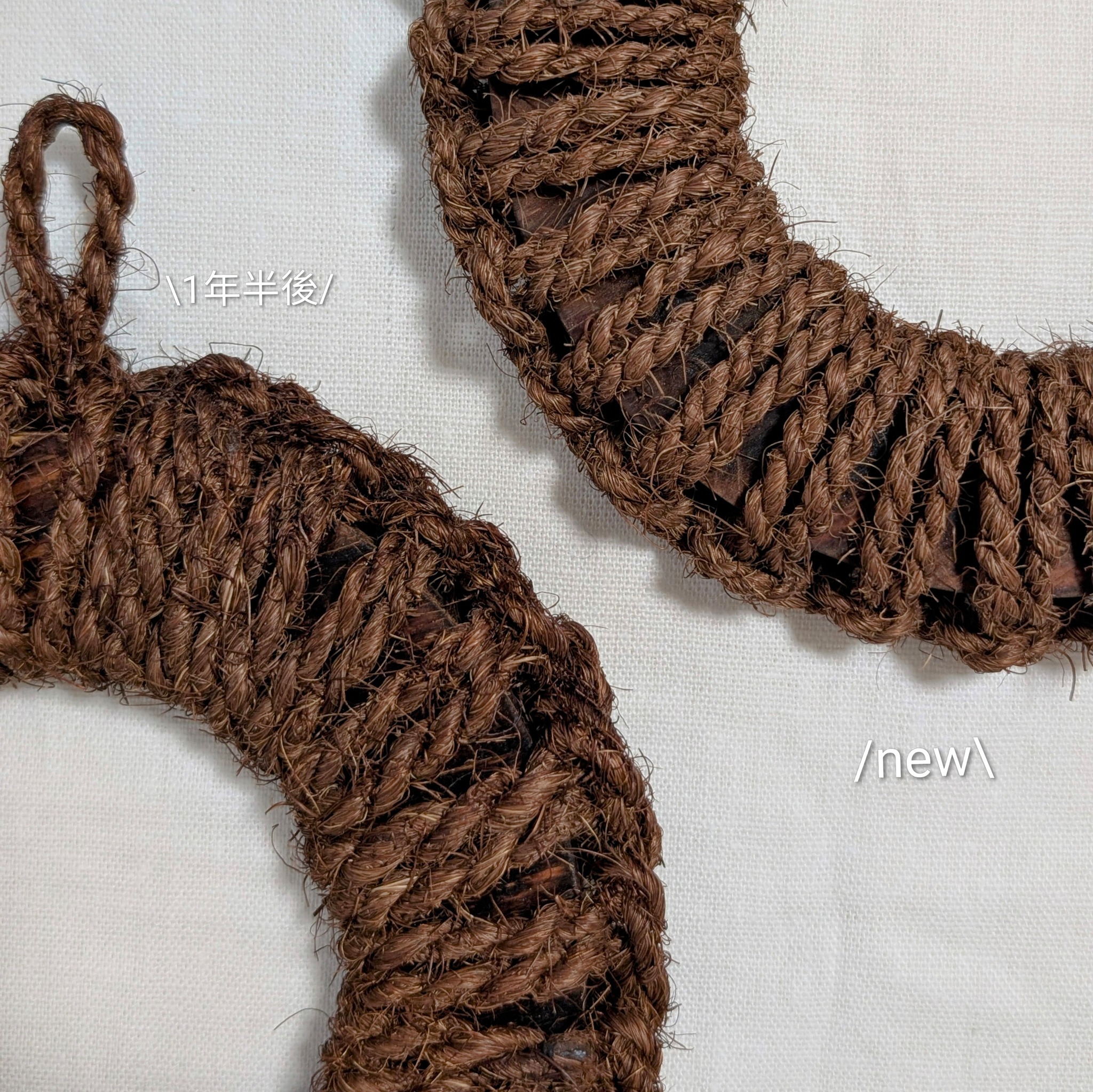 1年半使ったものは、芯の木と外側の棕櫚の結び目のあいだに少し空間ができているので、ほんの少し(5mmくらい)直径が大きくなっています。