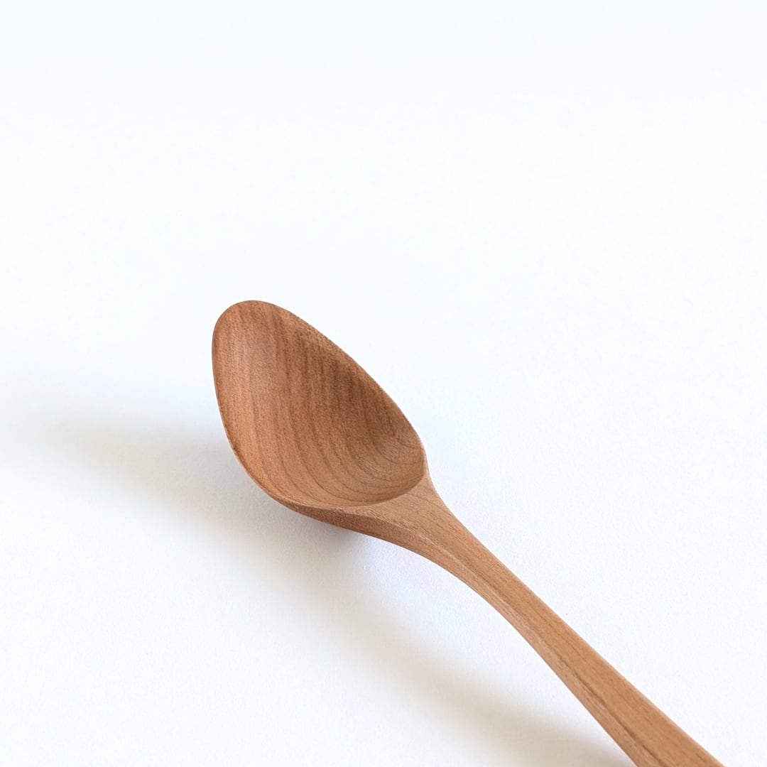 スプーンは食べる部分の角度がすこし急に見えますが、この角度が横からでも口に含みやすい。また先端に行くにしたがって木の厚みが一段薄くなっているので、口からすっと抜きやすく、とっても食べやすいんです。