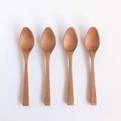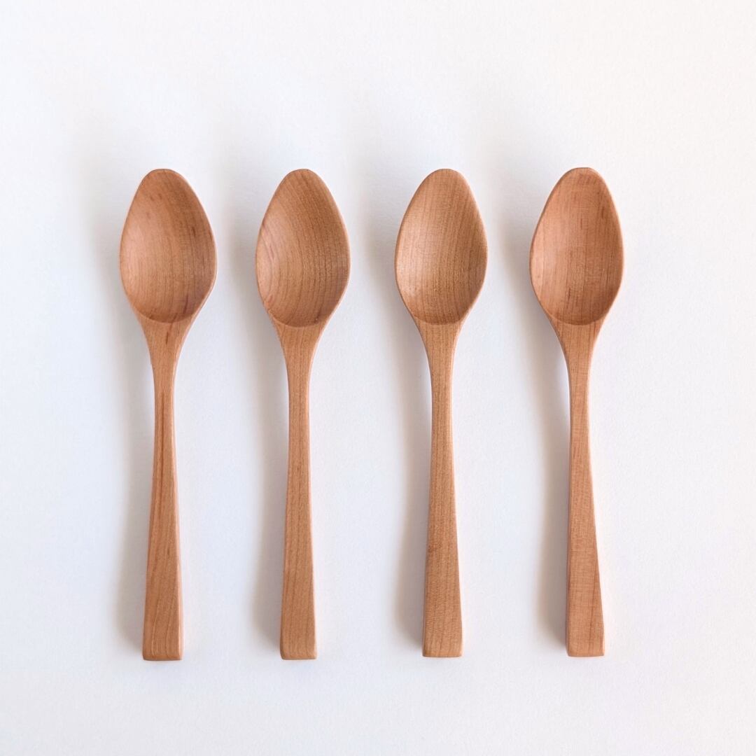スプーンは食べる部分の角度がすこし急に見えますが、この角度が横からでも口に含みやすい。また先端に行くにしたがって木の厚みが一段薄くなっているので、口からすっと抜きやすく、とっても食べやすいんです。