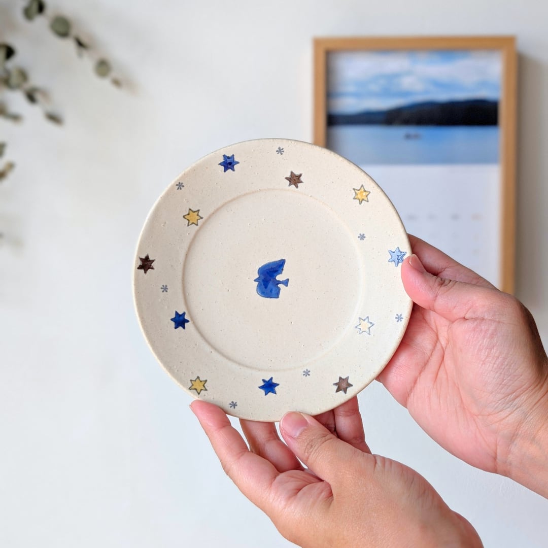 そんな岡さんの作る「上絵鳥と星紋5寸皿」は、色とりどりの星が散りばめられ、中心に青い鳥が一羽大きく羽を広げて飛ぶ、なんともかわいい一枚。