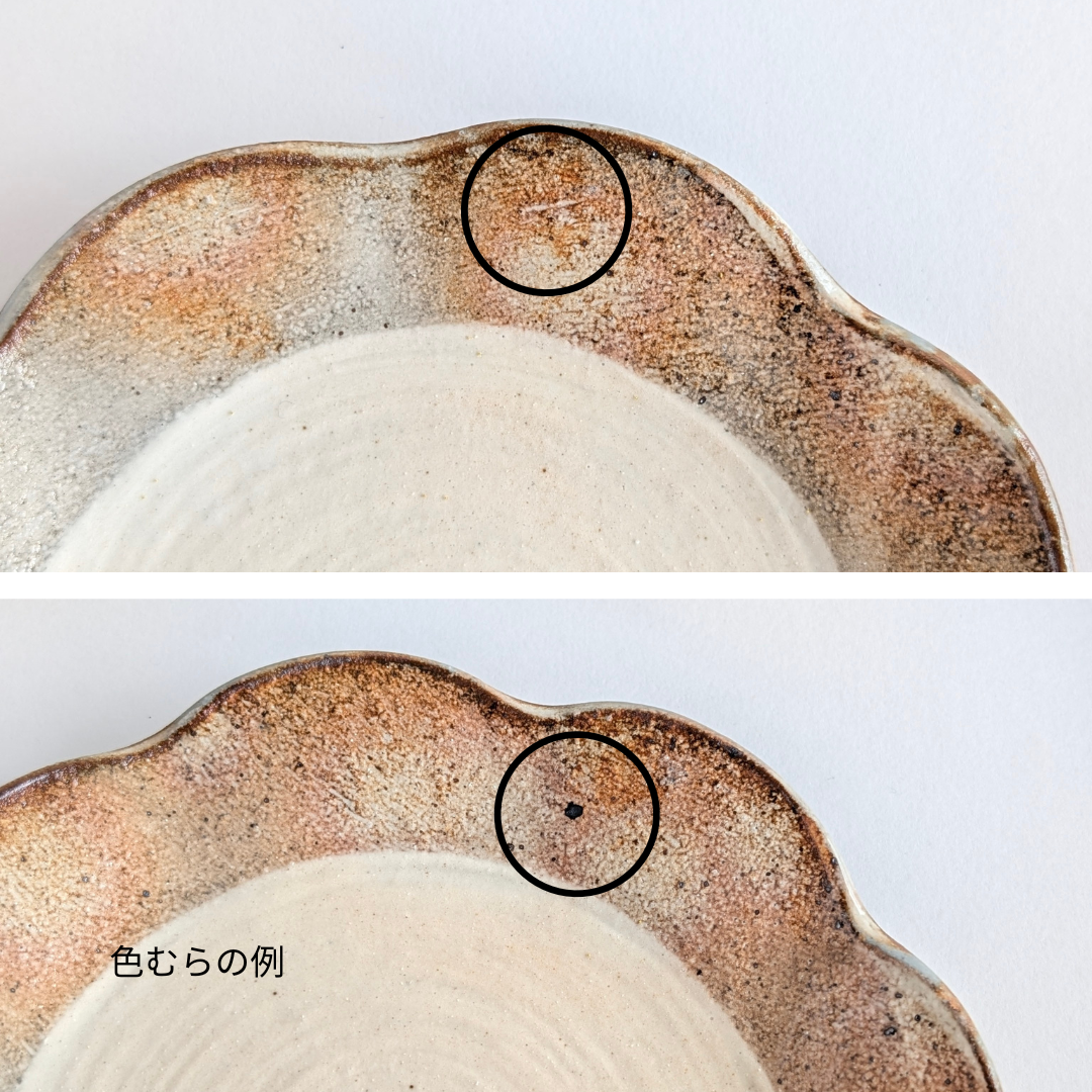 また、土の中の成分による茶斑点やピンホール(針でちょんと刺したような穴)が見られたり、完成時の色味や形、重量にも多少の違いがございます。