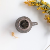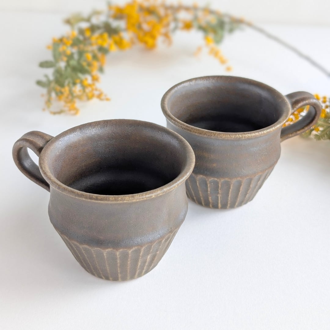 素朴な土感と、マットな錆(サビ)釉をかけた落ち着いた佇まいが印象的なカップ。