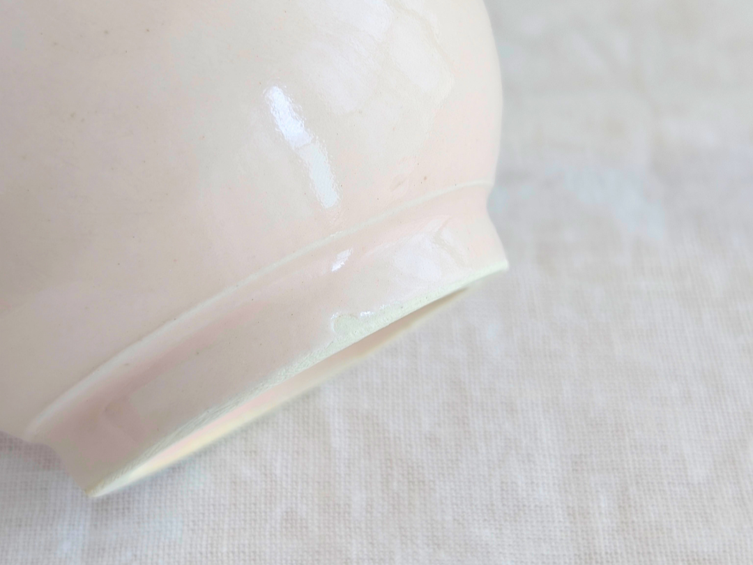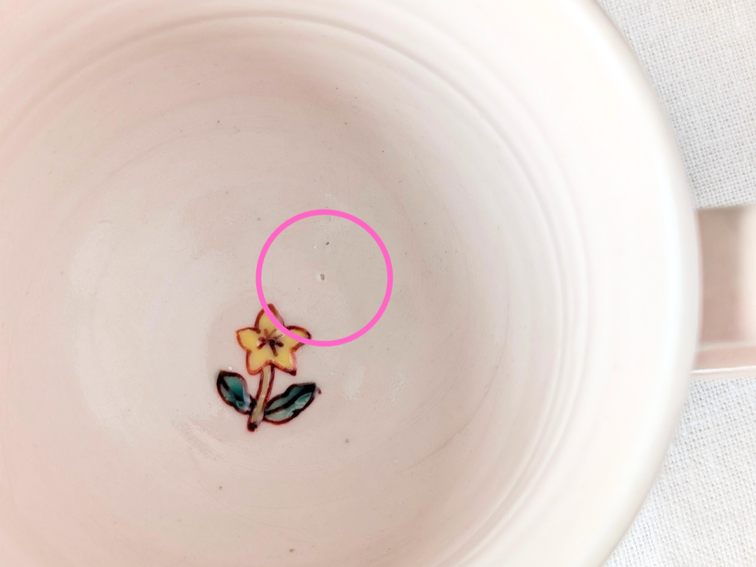 ・ひとつひとつ手作業で作られているため、同じ色味でも一点ごとに濃淡や貫入の入り具合が異なり「個体差」があります。また、釉薬のむらやピンホール(針でちょんと刺したような穴)が見られたり、完成時のかたち、重量にも多少の違いがございます。