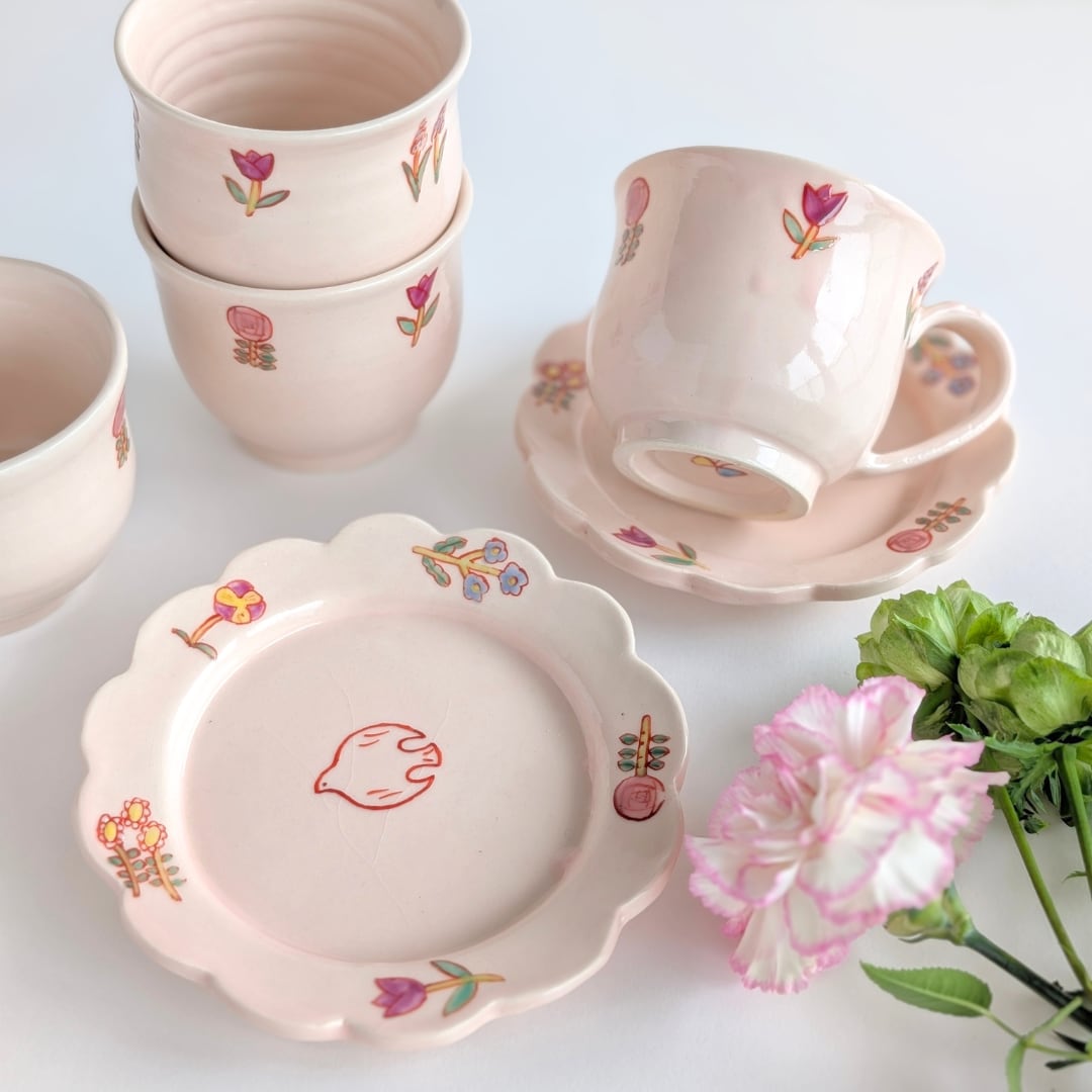 その作風はとても多様。アンティーク調の風合いのうつわから、鮮やかなパステルカラーのもの、くすっと笑ってしまう可愛い絵付けのものまで多くのうつわ作りをされています。