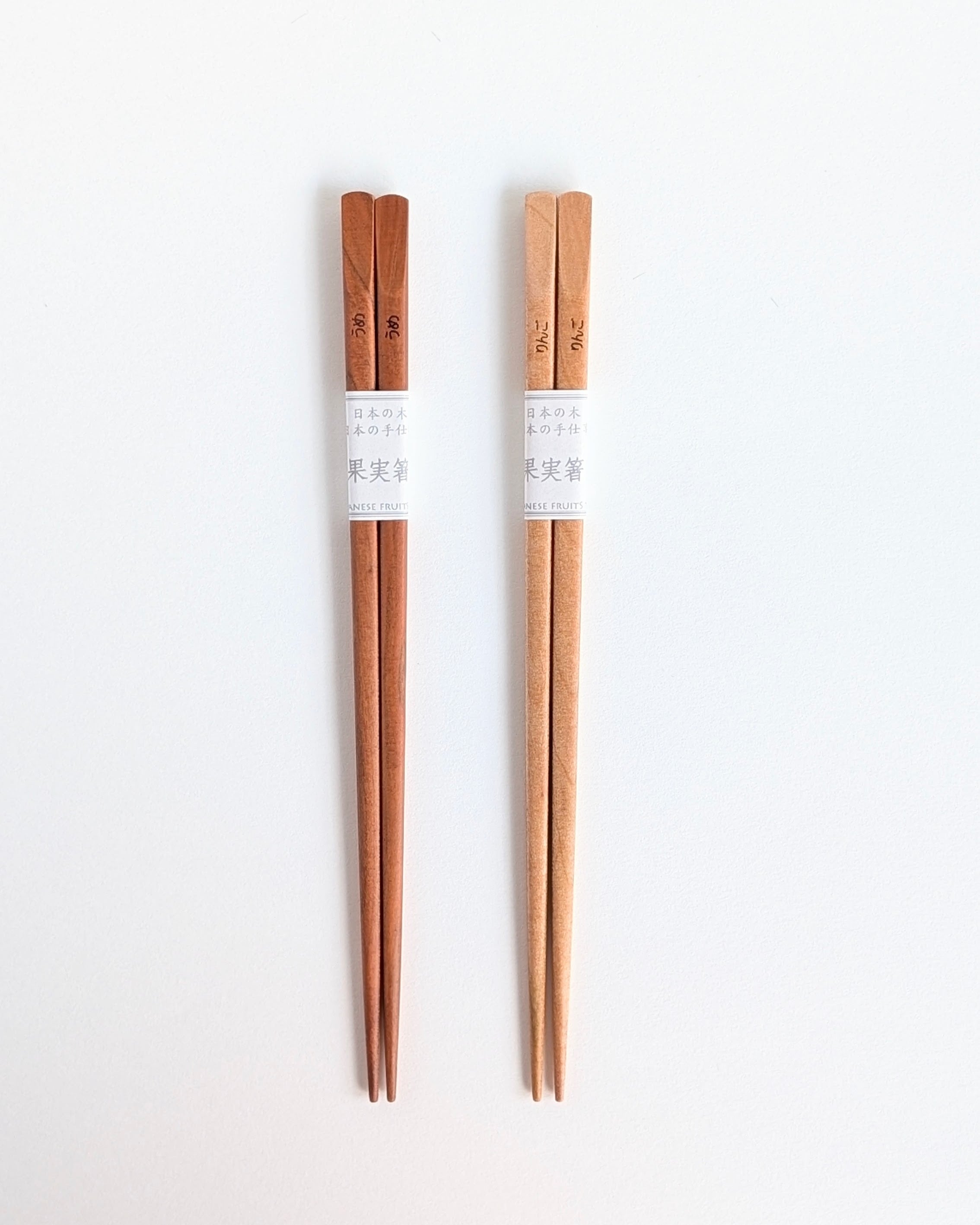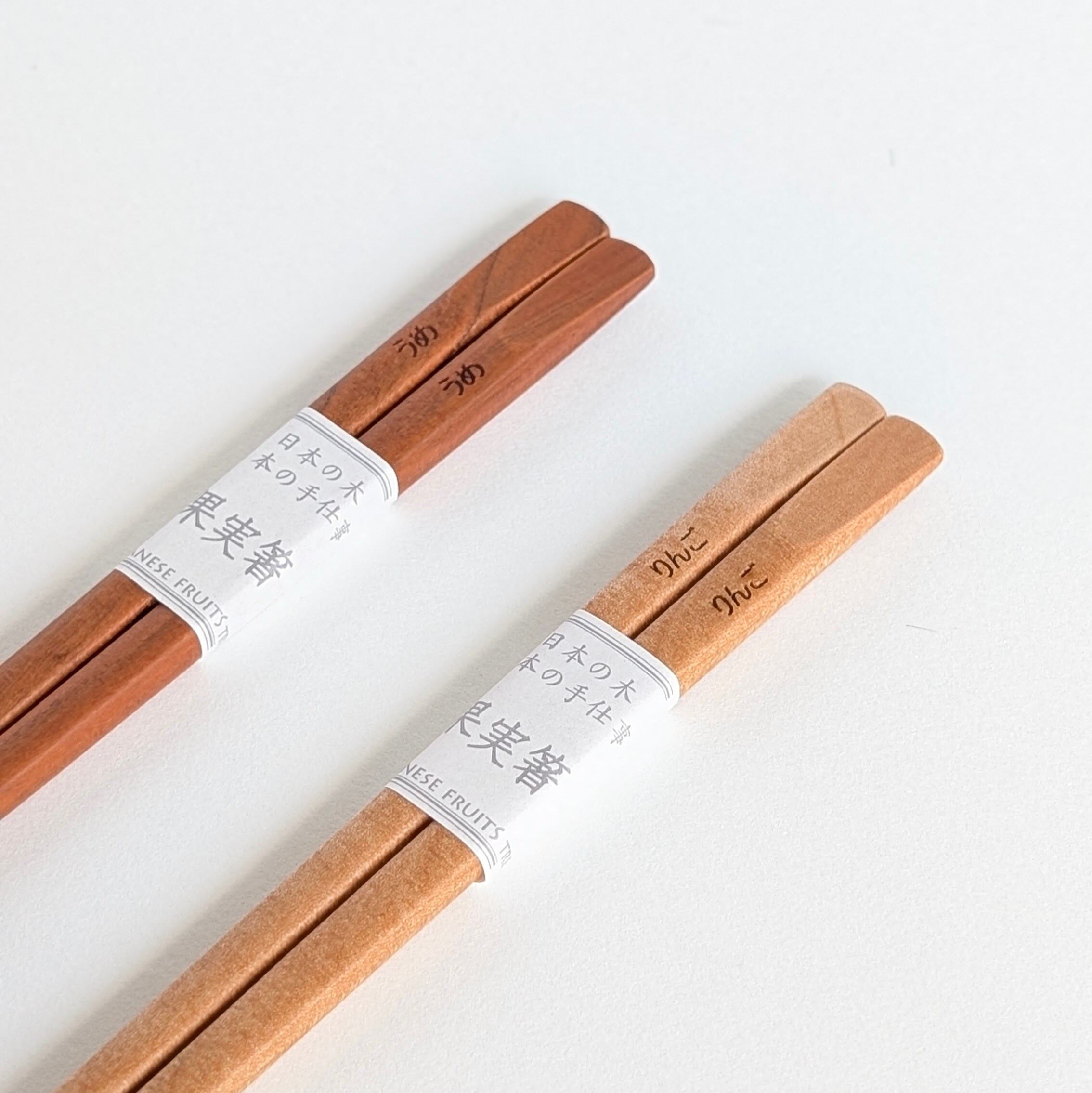 ナチュラルな色味の木肌に個性豊かな木目が映える『りんご』のお箸と、ちょっと赤みがかったあたたかい色味が素敵な『うめ』。